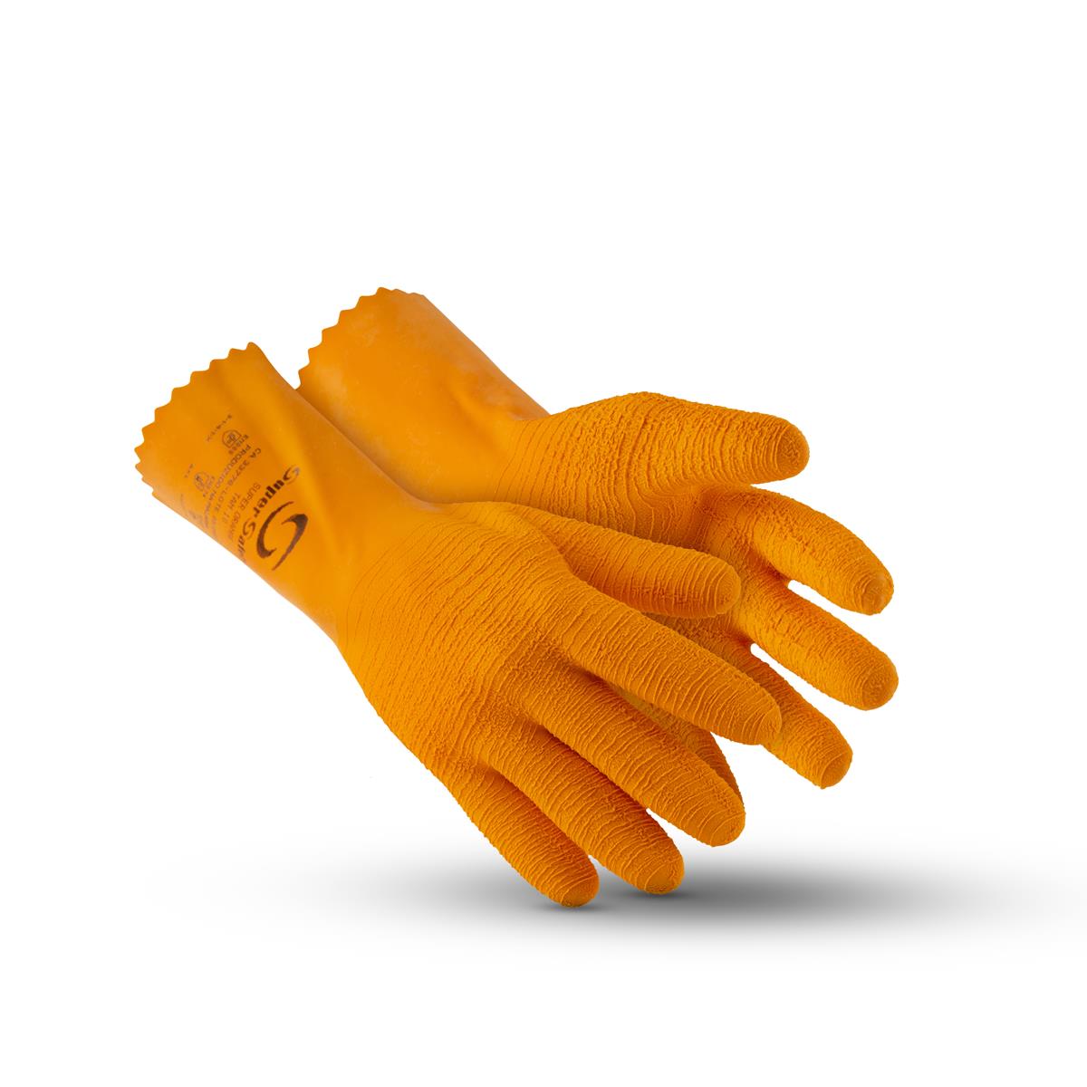 Luva de segurança, confeccionada em látex natural, revestida internamente com flocos de algodão, antiderrapante tipo diamante na face palmar e pontas dos dedos, formato anatômico.
