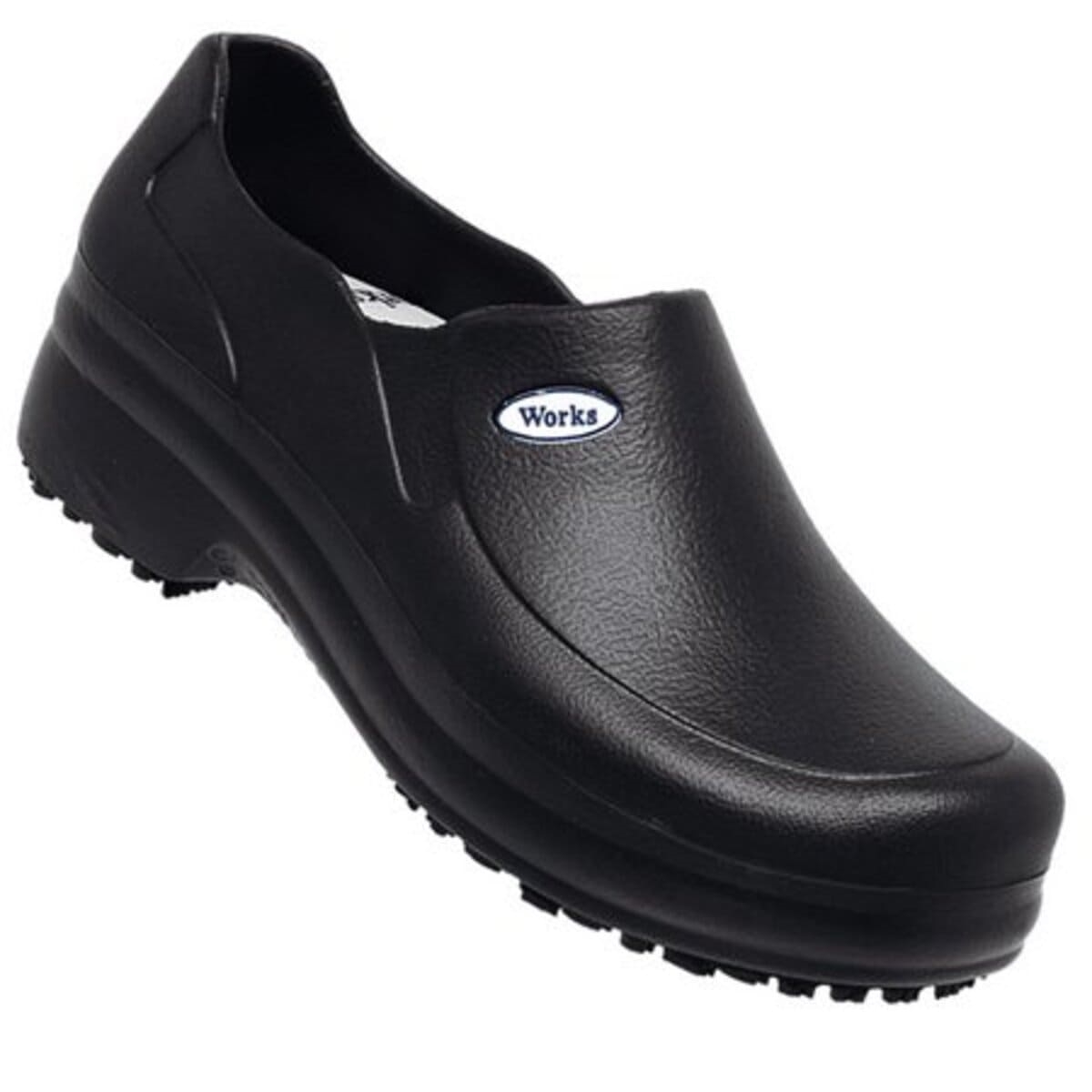 Sapato Unisex Soft Works é confeccionado em EVA (Etil Vinil Acetato), um material super leve, que permite extremo conforto e alta absorção de impacto. PALMILHA – EVA, com tecido parte superior. Contém antimicrobiano que atenua o odor nos pés. Bactericida – Contém substância Antimicrobiana junto à formulação composto EVA confecção do Cabedal, tecnologia antimicrobiana usada no combate as Bactérias Staphylococcus aureus (causadora de infecções a partir de pequenas feridas) e Escherichia coli (precursora de intoxicações alimentares em todo o mundo). Devidamente aprovado nos TESTES DE EFICÁCIA E ATIVIDADE ANTIMICROBIANA em conformidade com a Norma “JIS Z 2801”. O Solado é composto por uma borracha especial, com Tecnologia Super Grip resistente ao escorregamento em piso cerâmico com solução de detergente e em piso de aço com solução de glicerol, resistente ao óleo combustível e à absorção de energia na região do salto (o mais elevado nível de teste escorregamento).
